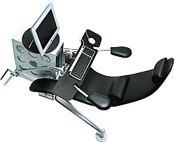 "Cadeira Netsurfer Numa versão actual do ditado popular podemos dizer que o computador é o melhor amigo do homem. Por razões profissionais e de lazer, passamos longas horas em frente de um monitor, nem sempre bem instalados. Esta cadeira futurista alia funcionalidade, estética, ergonomia e conforto num só elemento. Uma peça capaz de deixar os seus amigos verdes de inveja."